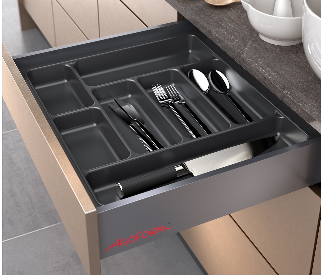 - Οι μονάδες είναι εξοπλισμένες με ένα πλευρικό φτερό έτσι ώστε ο δίσκος για τα μαχαιροπίρουνα να μπορεί να τοποθετηθεί ακόμη και σε ένα τμήμα του συρταριού,